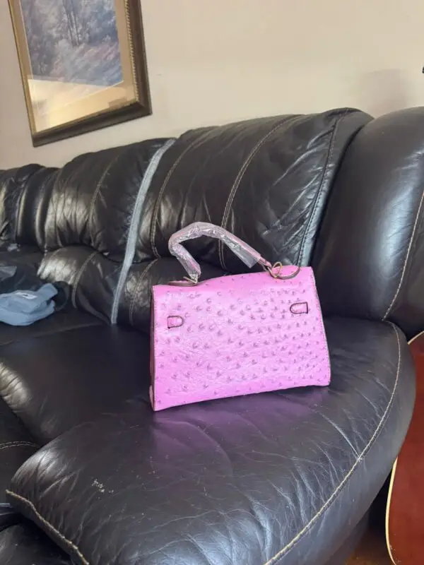 The handbag showcases a soft pink color that radiates femininity and modern luxury, making it the perfect statement piece for both everyday fashion and special occasions. The distinctive ostrich leather pattern, combined with premium stitching and polished gold-tone hardware, creates a refined and luxurious aesthetic that complements both casual and formal outfits.